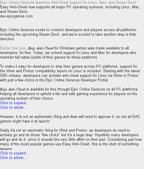 Epic Games adds complete Linux support for its EasyAnti Cheat service, along with official SteamPlay (or Proton) and Wine compatibility And, right after that, BattleEye also announced official support for Proton BattlEye has provided native Linux and Mac support for a long time and we can announce that we will also support the upcoming SteamShow More Show Less 5 Post; Looks like both of the big anti cheats that where messing up proton compatibility should be smooth out fairly soon This should fold in the few top 10/100 steam titles that where no goes Thought about posting this in the Steam Deck section however as this will instantly trickle up to desktop Linux I figure its more just general (good) news